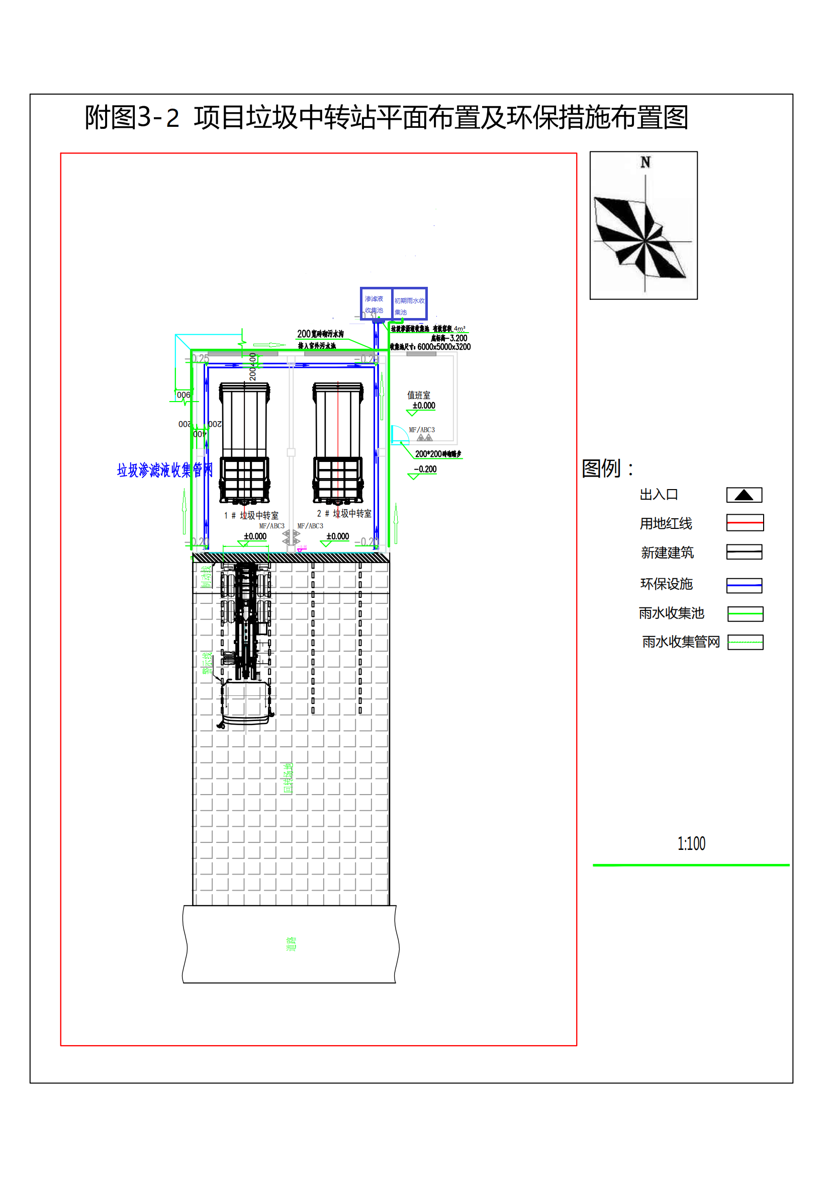 15m3垃圾壓縮箱2套,配套轉(zhuǎn)運車1輛,實際建設(shè)1個4m3的滲濾液收集池和1個4m3的雨水收集池。